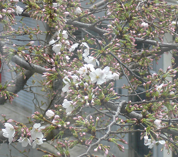 オフィス横の桜が、今日、花ひらきました。